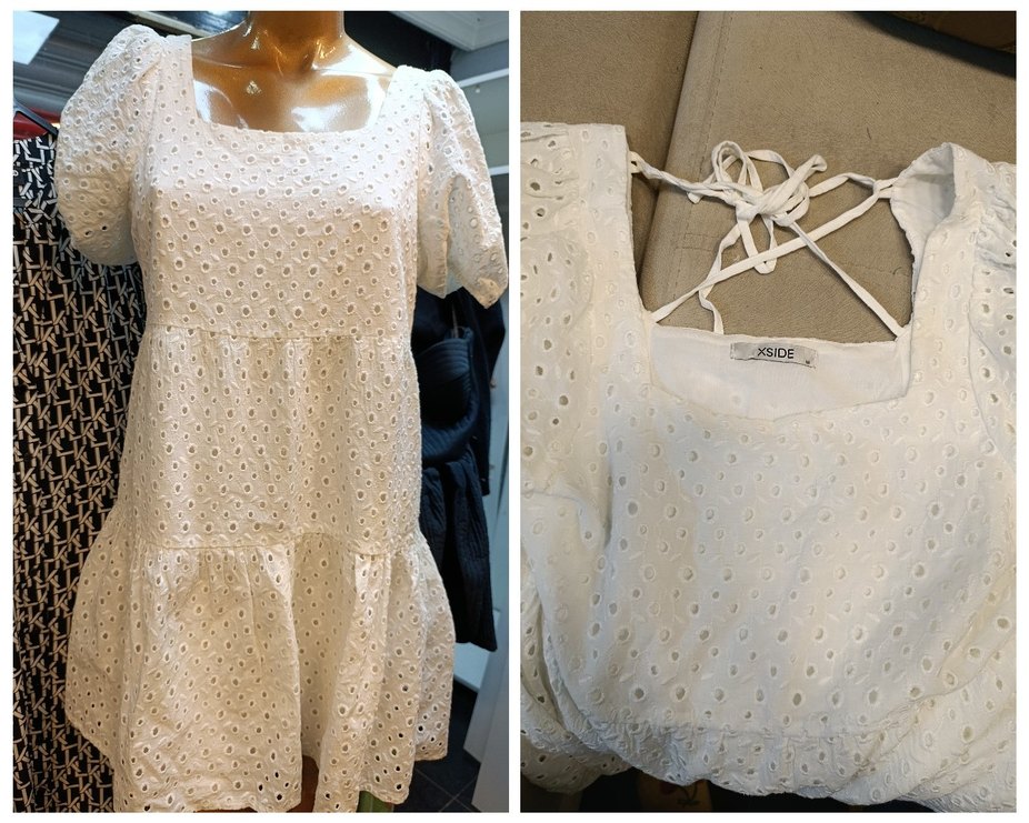 Beyaz mini elbise kısa kollu, tekne yaka ve nakışlı dantel detaylıdır. Pamuktan yapılmış, bol kesim ve günlük kullanım için uygundur. XSIDE markasıdır.