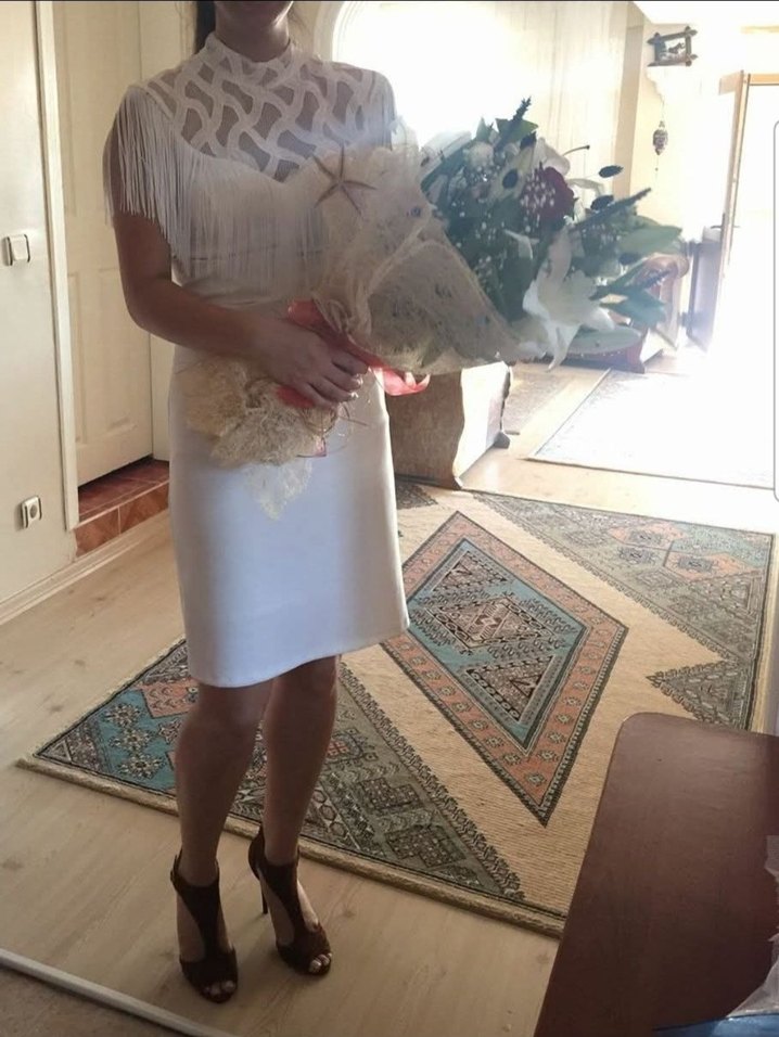 Bu beyaz mini 36 bedene uygun, omuz dantel ve püskül detaylı