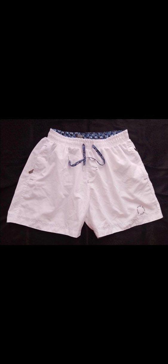 Gevşek kesim beyaz mini erkek deniz şortu, bağcıklı bel ile rahat ve şık bir yazlık stil sunar.