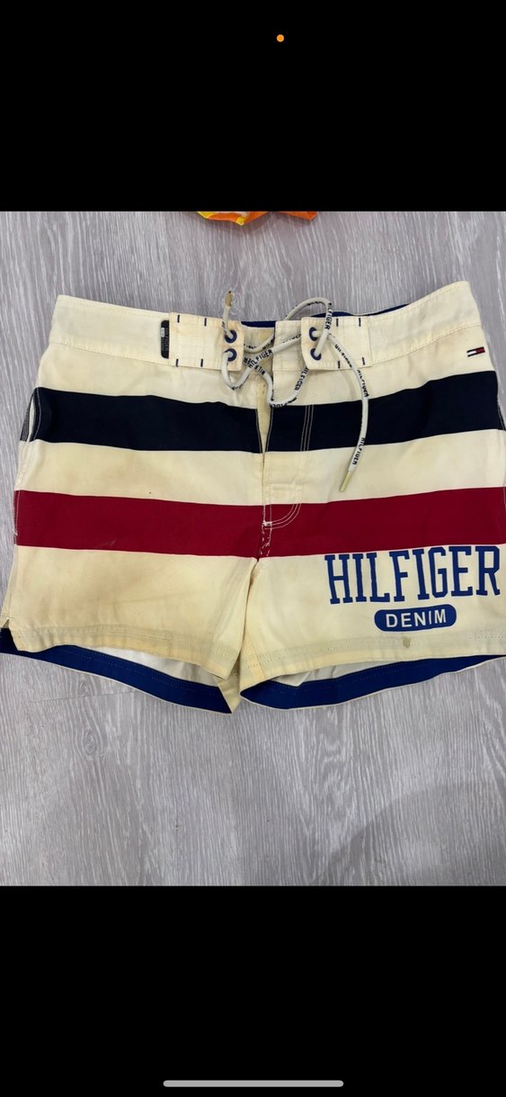 Beyaz renkte, bel kemerli ve kalıplı mini erkek mayo şortu, geniş yatay renkli çizgiler ve Hilfiger Denim logosu bulunur. Plaj için uygundur. ️
