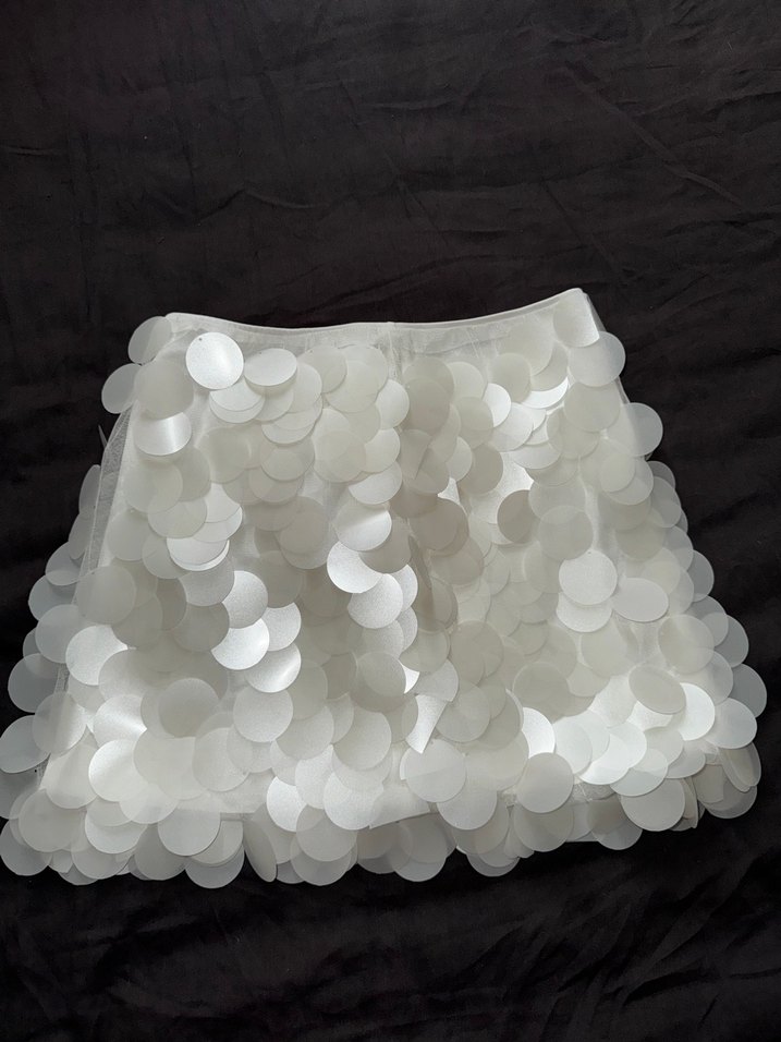 Dar kesim beyaz mini etek, fırfırlı detaylarla avant-garde tarzı yansıtır. Hafif ve desen içermeyen sentetik kumaştan üretilmiştir.