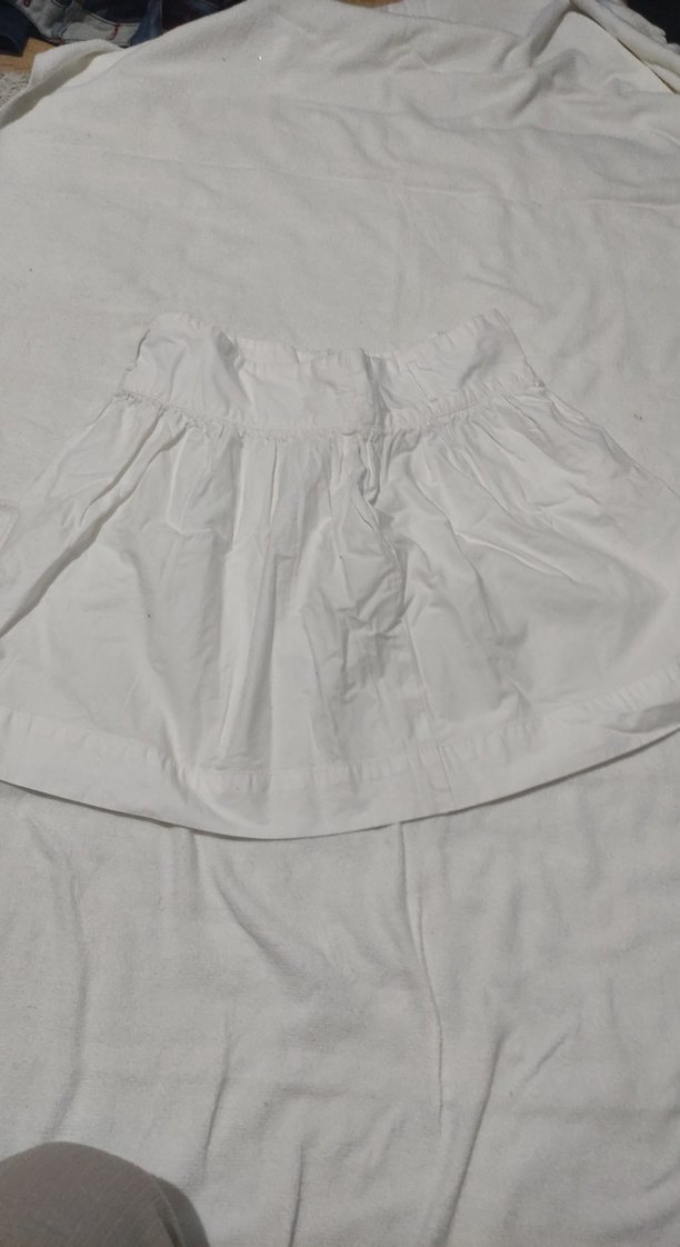 Beyaz renkli, keten kumaştan yapılmış, bol kesim ve fırfır detaylı mini etek. Açık hava kullanımı için uygundur.