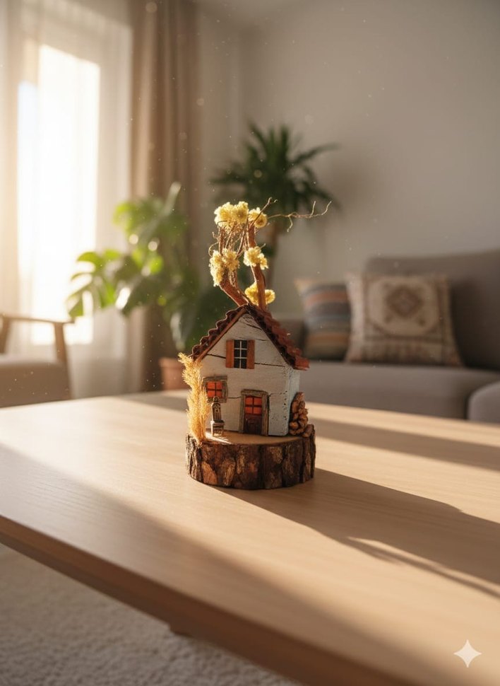 Beyaz mini ev figürü, kuru çiçekler ve kozalaklarla ahşap tabanda dekoratif bir hava katıyor.