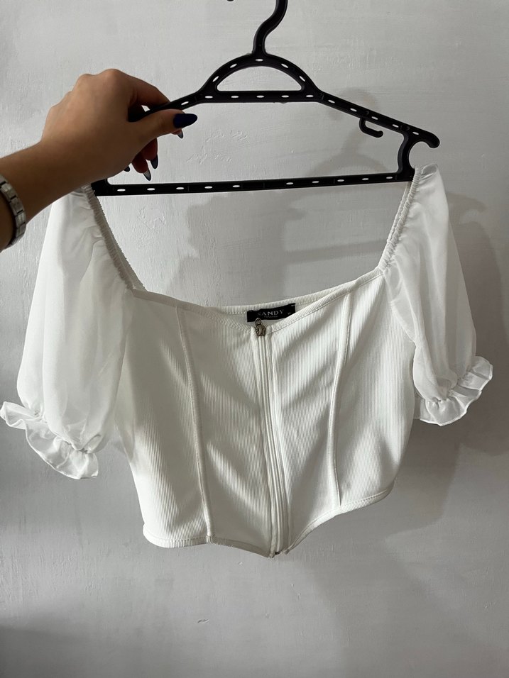 Beyaz, dar kesim mini bluz, tekne yaka ve kısa kabarık kollara sahiptir. Önünde fermuar bulunur ve yumuşak sentetik kumaştan yapılmıştır.