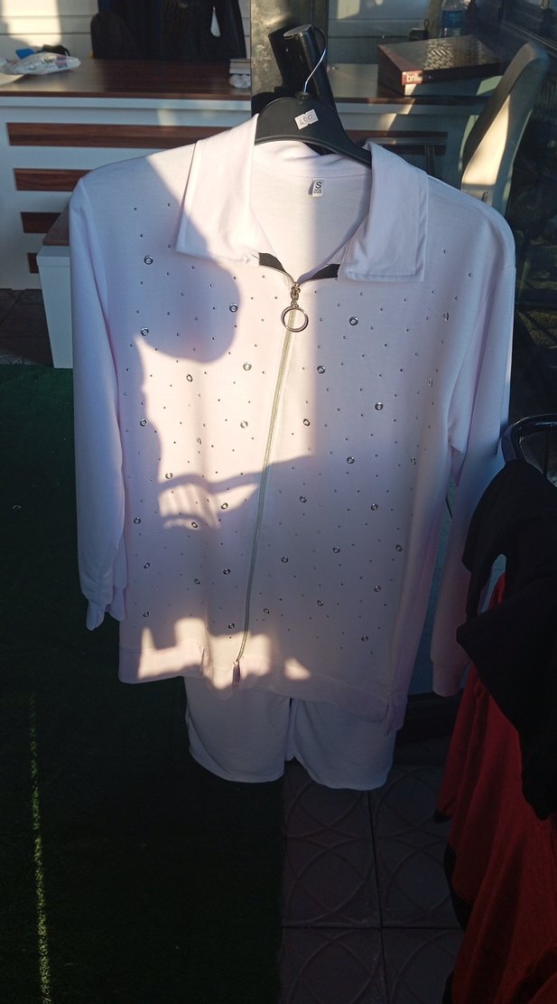 Kadınlar için kısa, bol kesim beyaz eşofman takımı, uzun kollu ve yuvarlak yaka. Hafif sentetik kumaştan, fermuarlı ve sade küçük noktalarla süslenmiş. Günlük ve sokak stili için uygun. s.m beden seçenekleri mevcut