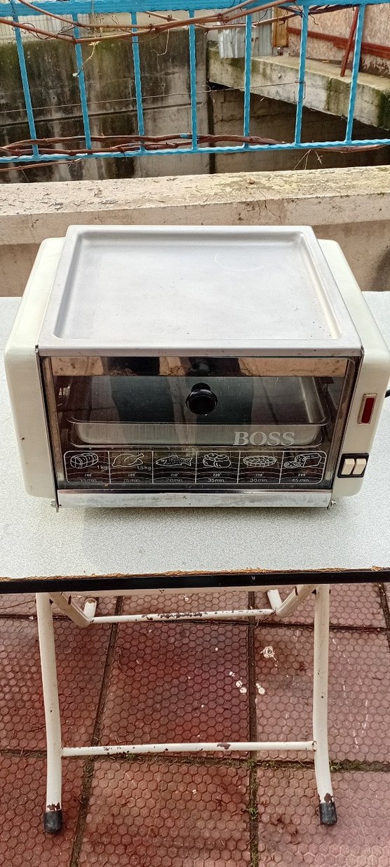 Beyaz ve gri renkte Boss marka, mini fırın çalışıyor hiçbir problem yok önünde şeffaf kapak ve yan tarafında kontrol düğmeleri bulunan tost ve sandviç makinesi. Üstünde ek tepsi mevcuttur.