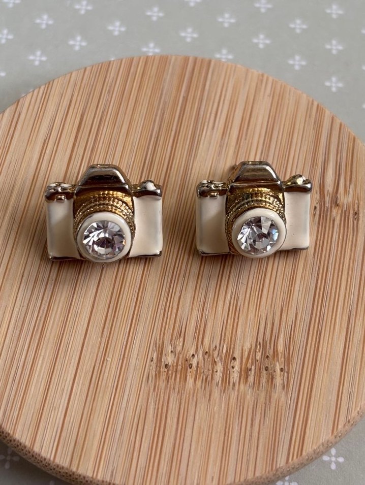 Parlak beyaz mini fotoğraf makinesi şeklinde, tokalı ve taş detaylı bohem tarzda küpeler. Fotoğraf makinesi şeklinde taşlı gold renkte küpe #küpe #takı #aksesuar #zara #mango #bershka #stradivarius #pullandbear #lefties #inditex #primark #lcw #koton #mavi #ltb