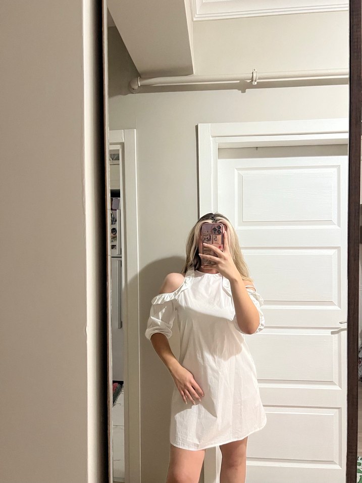 Koton kumaştan, kısa kollu ve straplez yakalı, bol kesim beyaz mini elbise. Minimalist ve rahat tarz, günlük kullanım için uygun.