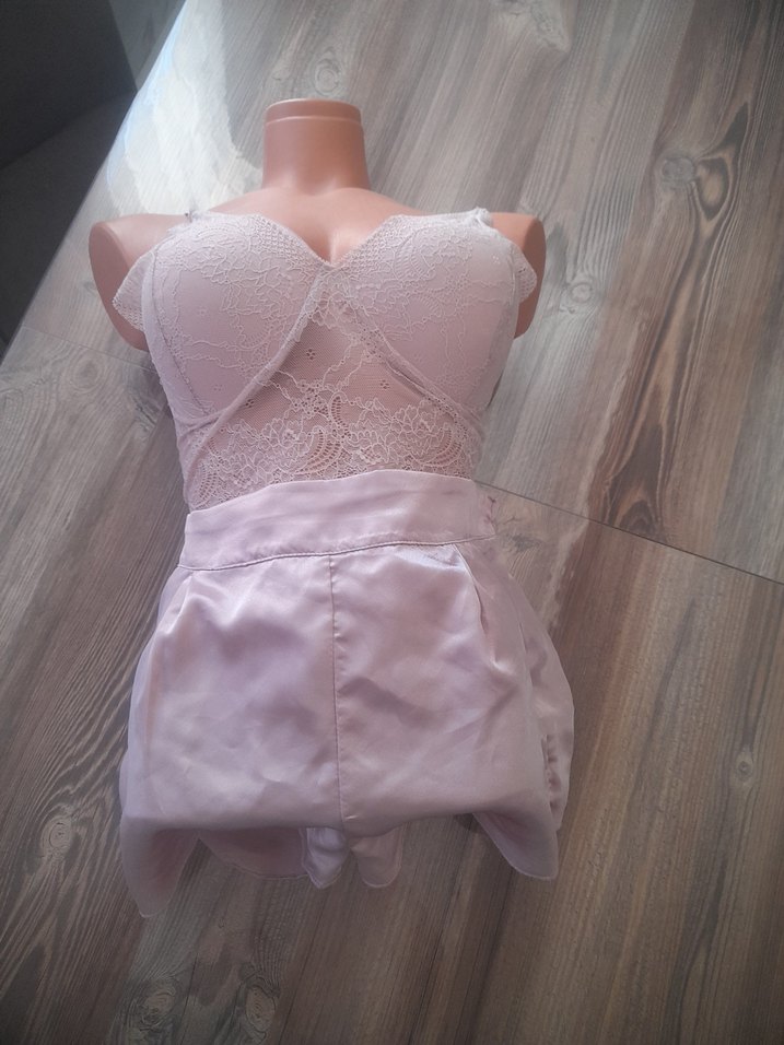 Pastel beyaz renkte, kısa boy ve dantel detaylı, desensiz, vücuda oturan mini hemşire korsesi.