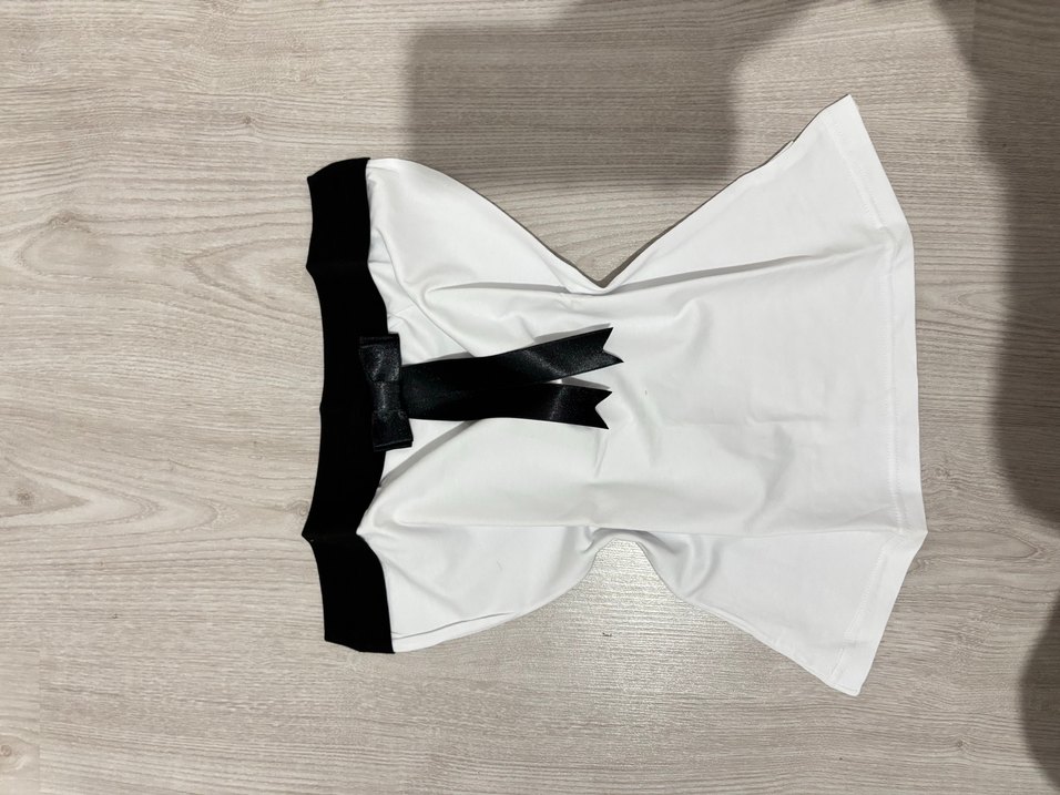 Siyah detaylı, kısa mini boy beyaz hemşire korsesi. Düz ve vücuda oturan tasarım, dekoratif fiyonk ile tamamlanmıştır.
