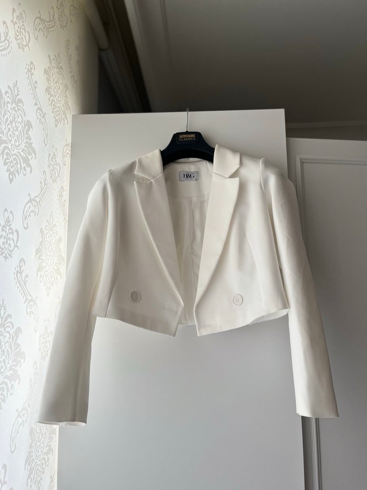 Beyaz renkte, düğmeli kısa kesim kadın blazer ceket. Uzun kollu ve sentetik kumaştan, klasik şıklık için ideal.