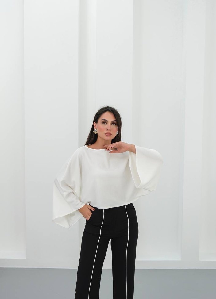 Beyaz mini bluz, uzun kollu ve salaş kesimdir. İpek gibi kumaştan üretilmiş, desen içermeyen minimal tasarımıyla gündelik kullanıma uygundur. ✨