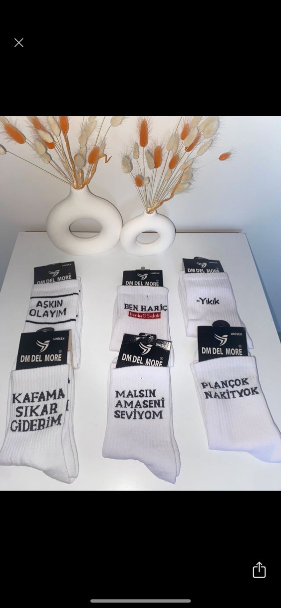 Beyaz mini uzunlukta, rahat kesim kadın çorapları üzerinde yazılı Türkçe desenler bulunur. Konforlu ve rahat bir yapıya sahiptir. Toplu fiyatıdır