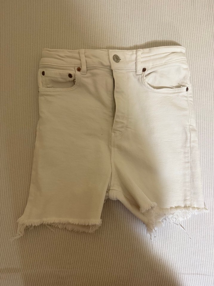 Beyaz mini denim şort, pamuklu yumuşak kumaş ve salaş kesimle günlük rahat şıklık sunar.