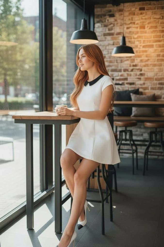 Siyah çok sevimli yakalı, beyaz çan etek elbise. Hem seksi hem cici. Çok beğenerek aldım ama bana çok kısa geldi. Boy ölçüsü enseden etek bitimine 73 cm. Tok, esnek ve hafif kalın, vücudu saran bir kumaşı var. Külotlu çorap, çizme ve trençkotlarla sonbahar/kışta da giyilebilir. 34/36 beden arası 34 için daha uygun. Etiketini aldığımda kesmiştim maalesef. Tahminimce modelin boyu 1.60 filan.