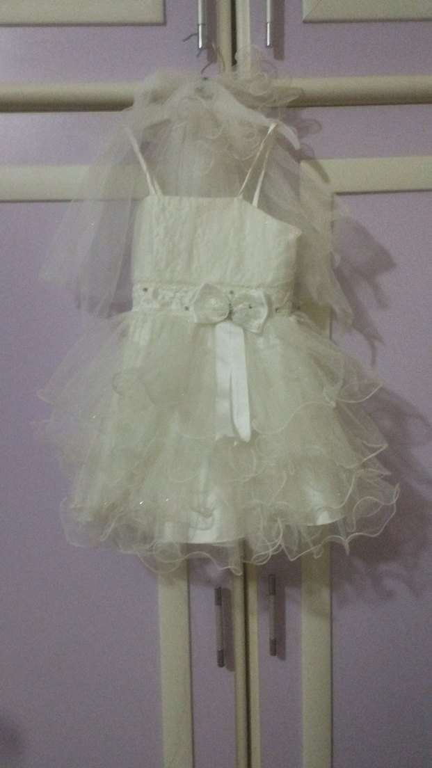 Diger markanın beyaz mini kız çocuk abiye elbisesi, ince askılı, oturan üst kısmı ve fiyonk detaylı kat kat etek tasarımı ile düğünler için uygundur. duvaklı gelinlik