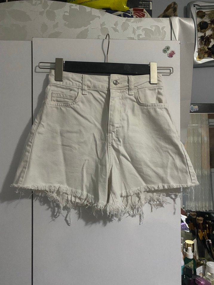 Beyaz pamuklu kot şort, püsküllü kenarlarıyla günlük sokak stiline uygun, zahmetsiz şıklık sunar. Sorunu yok
