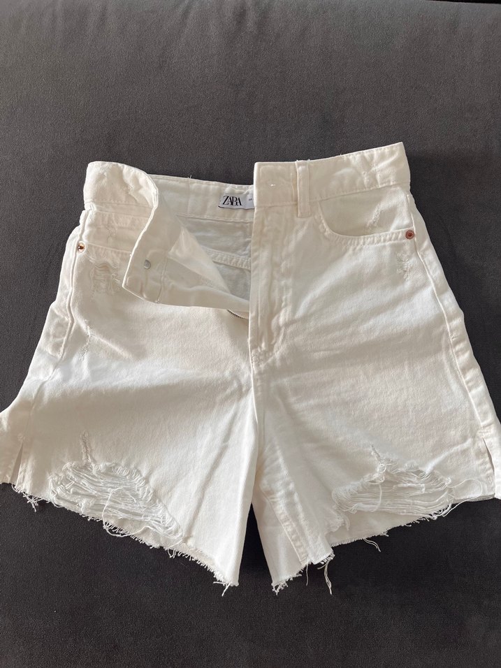 Pamuklu kumaştan beyaz mini kot şort, rahat kesim. Hafif yıpranmış etek ucu ile gündelik sokak modasında şık ve rahat.