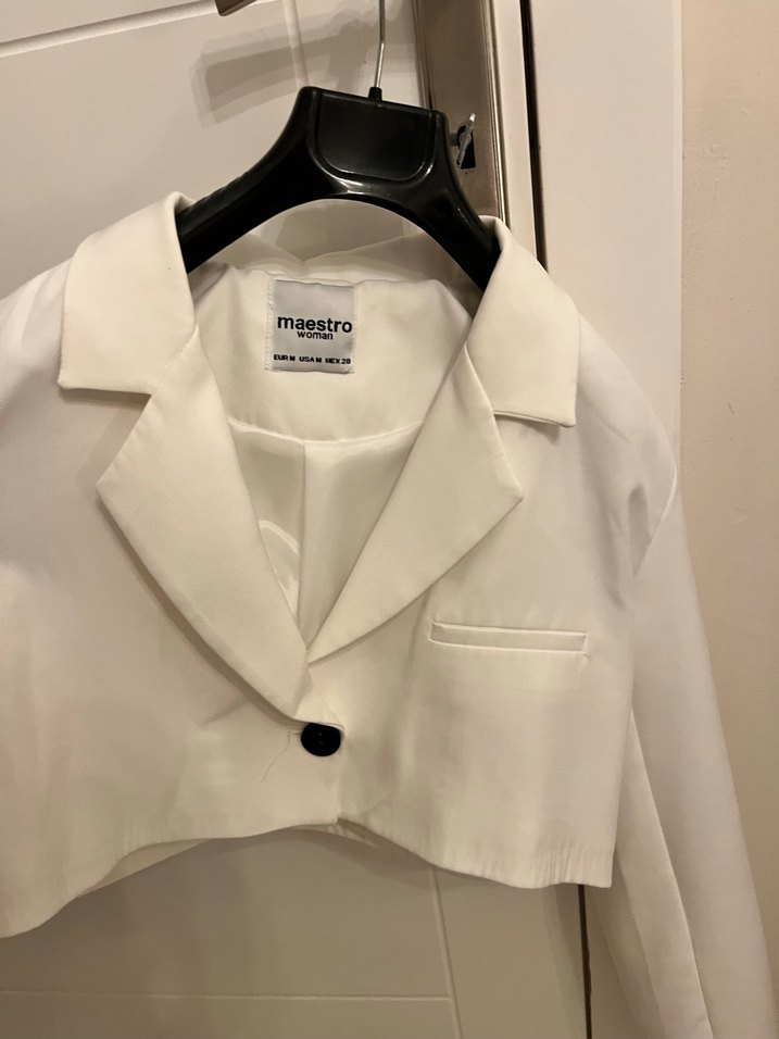 Beyaz keten kumaştan mini blazer, yakalı ve düğmeli. Uzun kollu, regular fit, ofis için şık ve rahat bir seçenek. Marka: Maestro. ✨