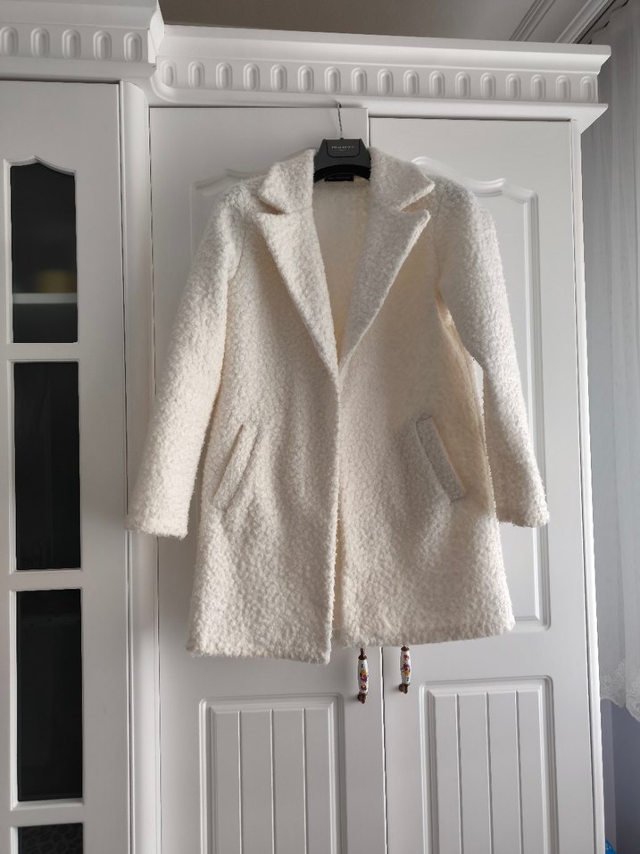 Beyaz renkli, kısa boy, uzun kollu kadın kabanı, yumuşak ve sıcak kumaştan, kürk detaylı ve notched lapel yakaya sahip, rahat bir sokak stili sunar.