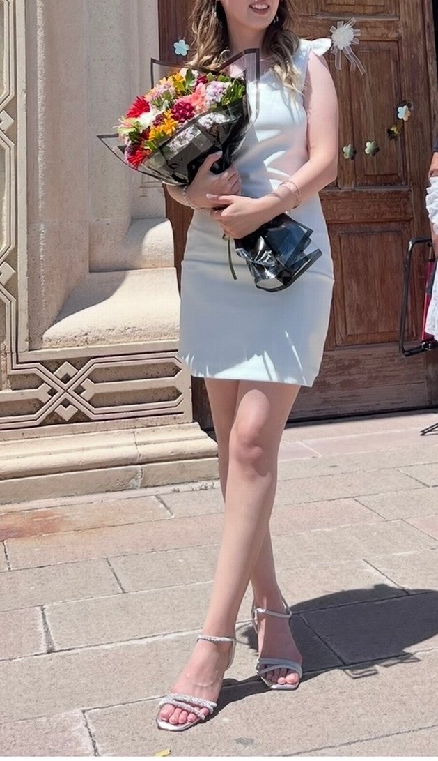 Beyaz, askılı, tokalı detaylara sahip mini, vücuda oturan mezuniyet elbisesi. Düğün ve şık günlük kullanıma uygundur.