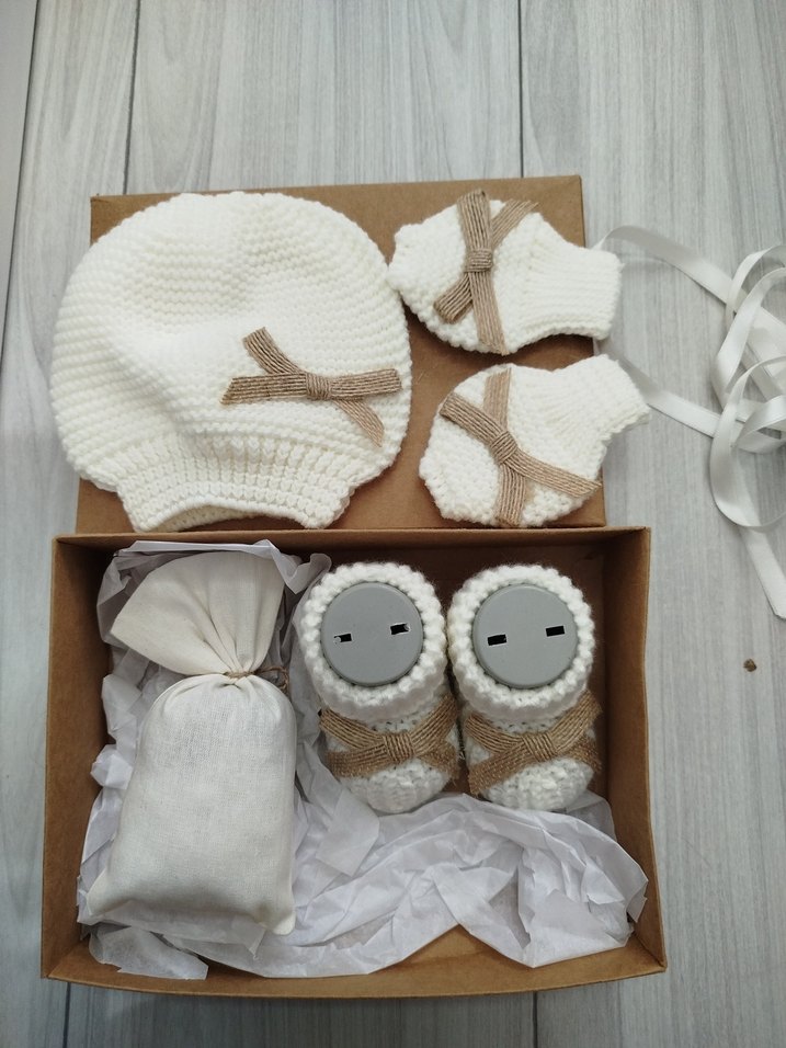 Beyaz mini örgü bebek seti, şapka, eldiven ve patiklerden oluşur. Bej fiyonk detayları vardır. Yumuşak dokuludur, yenidoğanlar için uygundur.