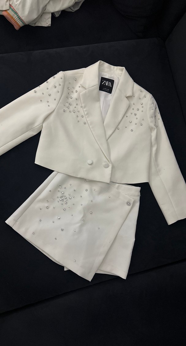 Beyaz mini blazer ve etek takımı, notlu yaka ve uzun kollu. Payet detaylarıyla süslenmiş, iş ve sokak stili için uygun, düğün ve avangart moda için ideal. ✨