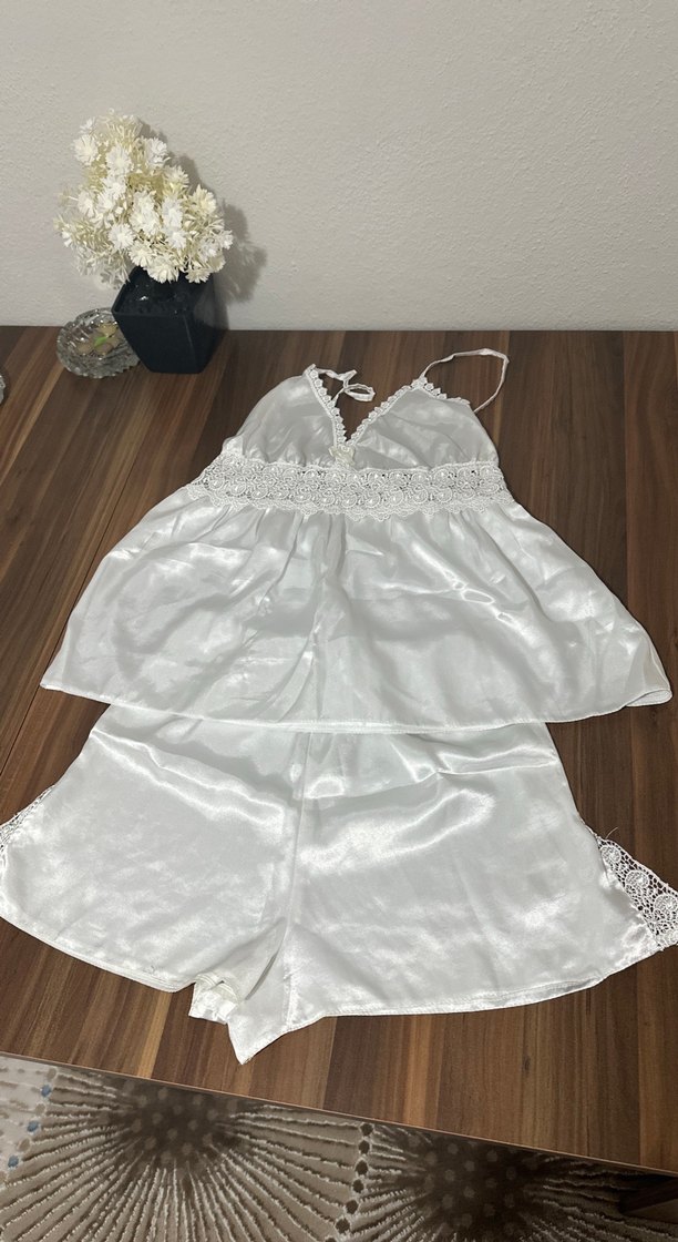 Beyaz parlak saten kumaştan, ip askılı ve dantelli detaylı, vintage bohem tarzda bol kesim mini pijama takımı.