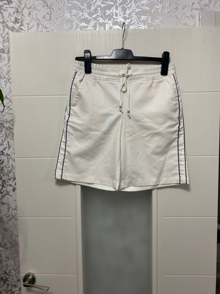 Beyaz mini şortlar, rahat kesim ve belden bağlamalıdır. Yumuşak kumaştan üretilmiş, yanlarda siyah şerit detayları vardır.
