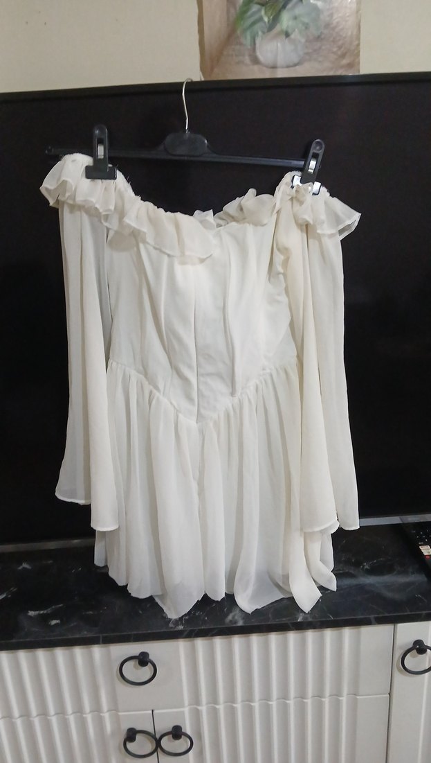 Beyaz mini gelinlik, straplez yaka ve salaş, dökümlü kollara sahiptir. Vintage esintili bohem tarzıyla kısa ve rahat kesimdir.