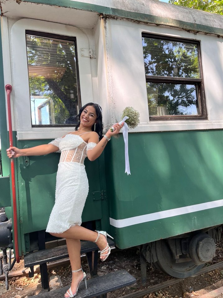 Beyaz mini gelinlik, straplez yaka ve ince askılı kollarıyla avant-garde ve streetwear tarzını birleştirir. Fit kesimle şık ve modern görünüyor.