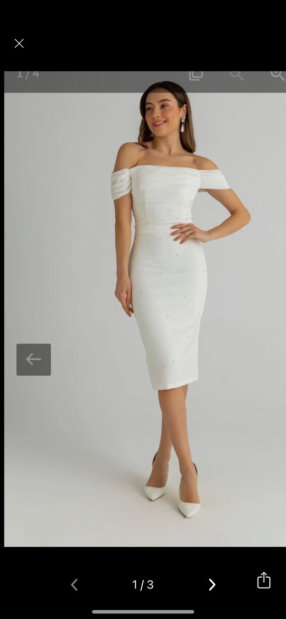 Beyaz, vücuda oturan kalem elbise, straplez ve ince askılı kollara sahip olup, inci detaylarıyla süslenmiştir. Kısa boyu ve pürüzsüz sentetik kumaşıyla çağdaş bir görünüm sunar. ✨