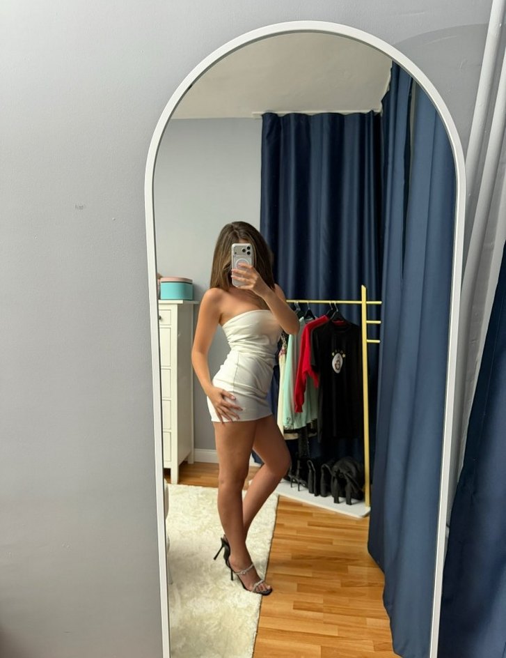 Bu beyaz mini elbise, straplez yaka ve ince askılarla tasarlanmıştır. Fitted kesimi ve çağdaş stiliyle romantik akşamlar için şık ve sade bir tercih sunar.