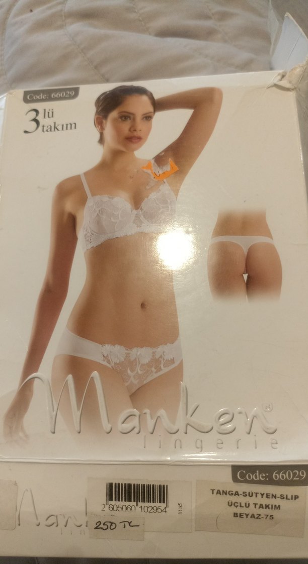 Dantel detaylı beyaz mini sütyen takımı, kısa kesim. Üçlü set halinde sunulmaktadır. Code66029.