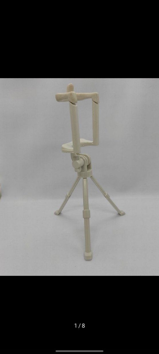 Ayarlanabilir ayaklara ve telefon tutucusuna sahip beyaz mini tripod ve selfie çubuğu, fotoğraf ve video çekimleri için uygundur.