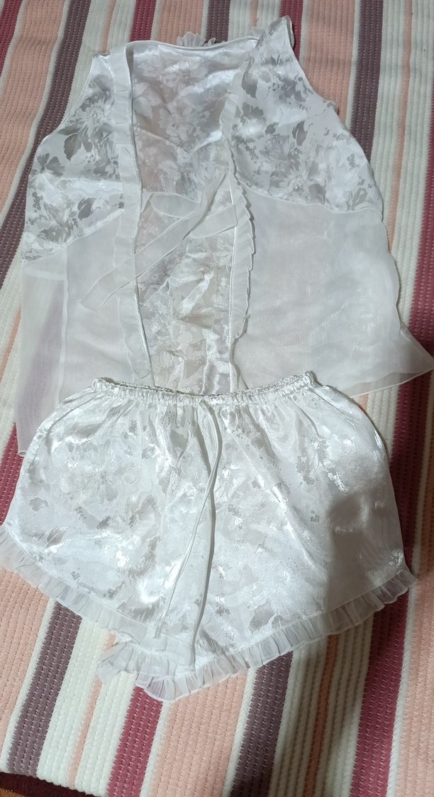Vintage tarzda, beyaz renkli, kısa kollu ve bol kesim kadın pijama takımı. Çiçek desenli, yumuşak kumaştan rahat kullanım sağlar.