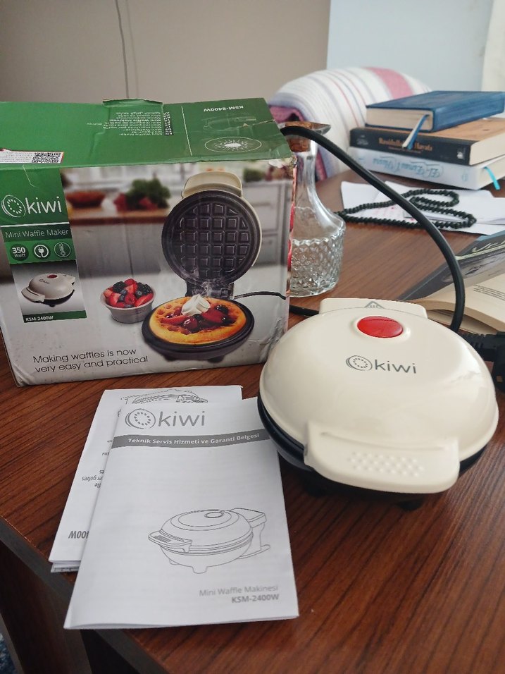 Beyaz renkli Kiwi mini waffle makinesi, kompakt tasarımı ve kolay kullanımı ile hızlı waffle yapmanızı sağlar. Küçük mutfaklar için pratik bir üründür. tertemiz üç kere kullanıldı
