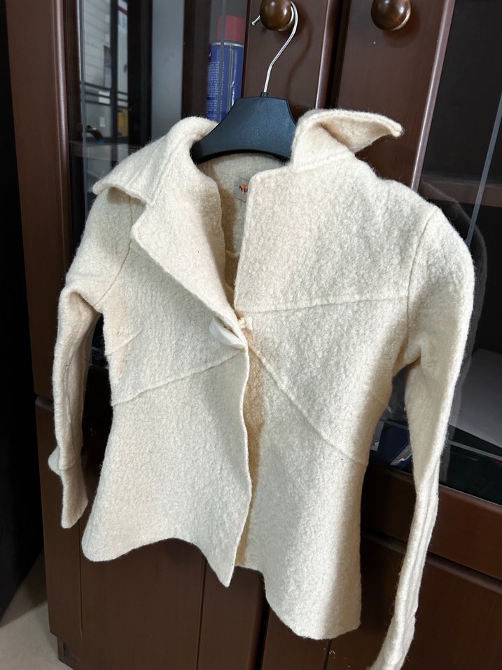 Yumuşak yün kumaştan yapılmış, düğmeli ve mini kesim beyaz ceket . Notlu yaka detayıyla günlük rahat ve şık bir tarz sunar. 38 yazıyor ama 36 bedene olur