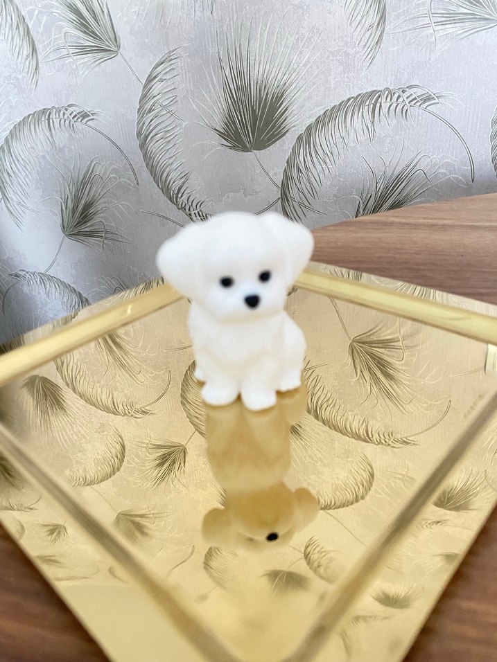 Yumuşak dokulu küçük beyaz peluş köpek, sevimli bir koleksiyon veya dekorasyon için uygundur.