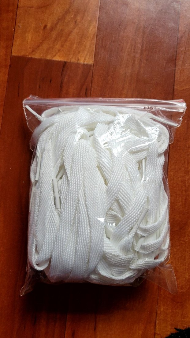 Minimalist tarzda, dayanıklı malzemeden yapılmış beyaz ayakkabı bağcıkları, kilitli poşette.