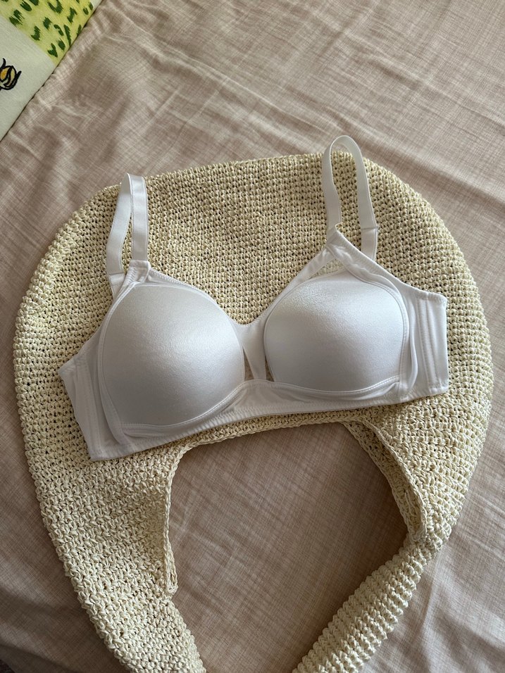 Beyaz, desen içermeyen, bohem tarzda minimalist sütyen. Normal boyda ve hafif, rahat bir kullanıma sahiptir. 80 beden etiketi kesik