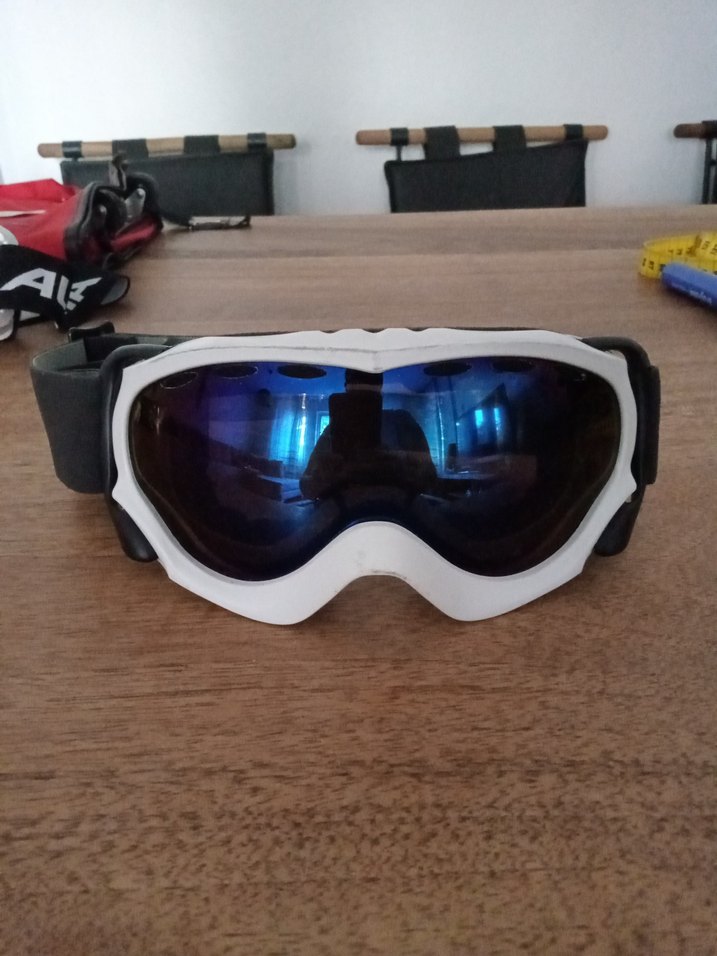 Yurtdışı ürünü Alman Koyu beyaz renkli, minimal tasarımlı, tokalı kayışa ve yumuşak keçe astara sahip erkek kayak gözlüğü. Desensiz ve bisikletçi tarzında.