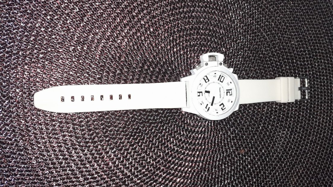 Beyaz kayışlı, renkli rock punk tarzı ve minimalist tasarıma sahip erkek kol saati. Basitlik ve canlı renkleri bir arada sunar. ⌚