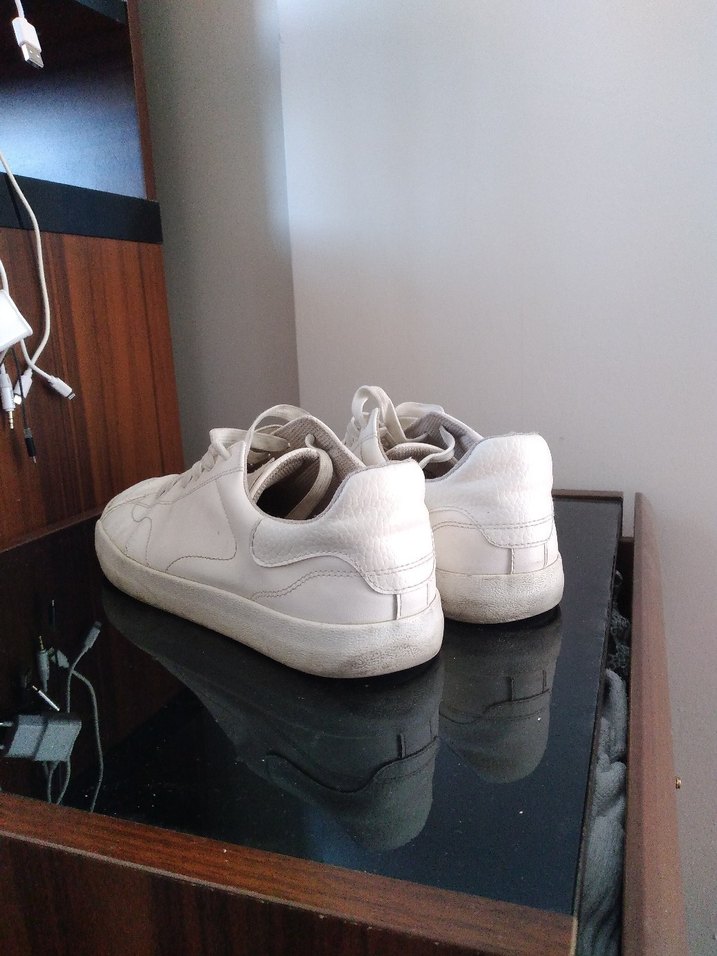 Beyaz minimalist Erkek spor ayakkabısı, kauçuk tabanlı ve topuklu, gündelik kullanıma uygun şık tasarım.