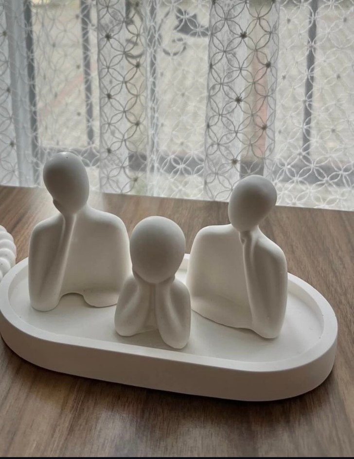 Beyaz, pürüzsüz malzemeden yapılmış üç soyut insan figürlü minimalist set, oval taban üzerinde. Modern dekor için uygundur. El yapımıdır kendim yapıyorum kadın erkek çocuk olmak üzere dörtlü ürün şeklinde satıyorum isterseniz bir çocuk daha ekleyebilirsiniz  Marc’a temsilidir
