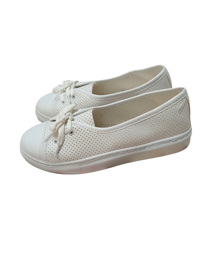 Beyaz minimalist kadın babetler, kauçuk malzemeden üretilmiştir. Sokak stili için uygun ve günlük kullanıma ideal, desensiz ve hafif görünümlüdür.