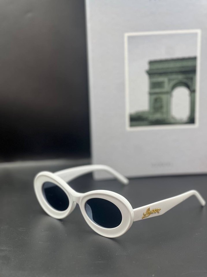 Oval çerçeveli beyaz minimalist kadın güneş gözlüğü, koyu renk camları ve yan tarafında ince altın logo detayı ile şık bir sokak stili sunar. ️