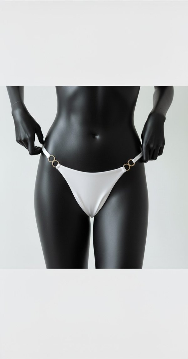 Beyaz ve ince kayışlı, metalik halkalı külot, minimal ve çağdaş bir görünüm sunar.