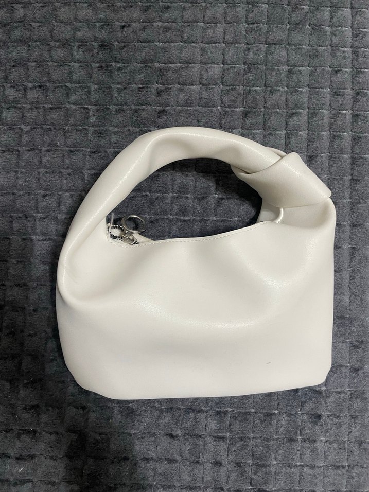 Düz beyaz, sentetik kumaştan yapılmış minimalist kadın omuz çantası, tokalı sap detayıyla sokak modasına uygun. Günlük kullanım için ideal.