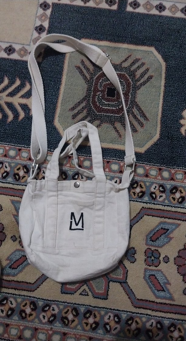 Baskılı desene ve ayarlanabilir askıya sahip beyaz tekstil kadın çantası, minimalist tarzda ve 'M' logosu bulunur. Günlük kullanıma uygun. markası farklı